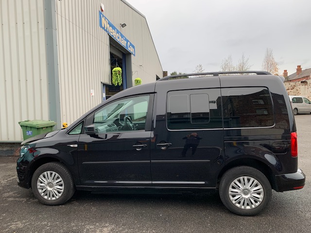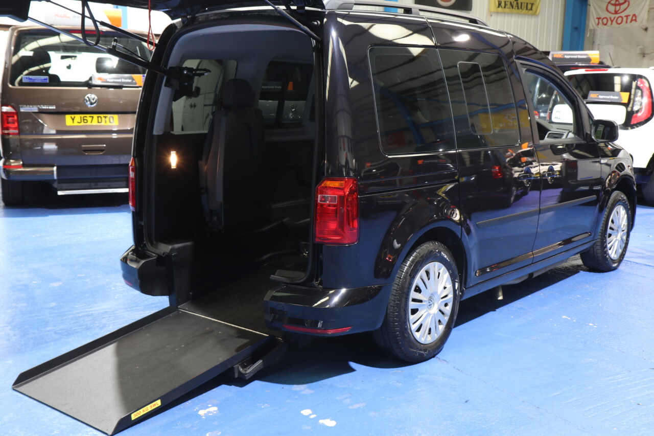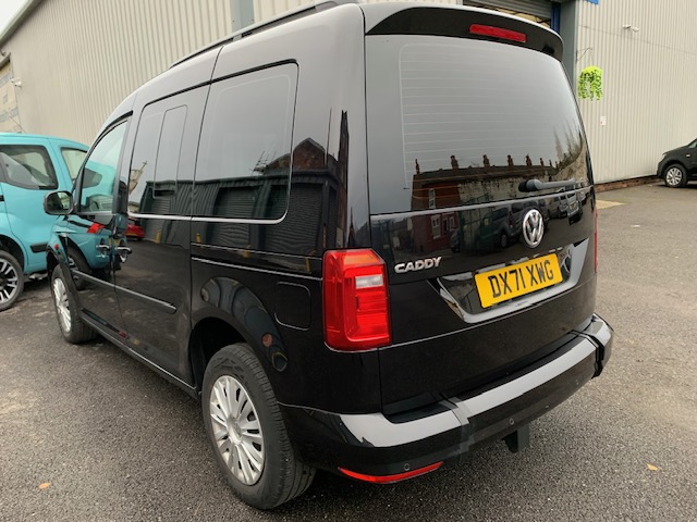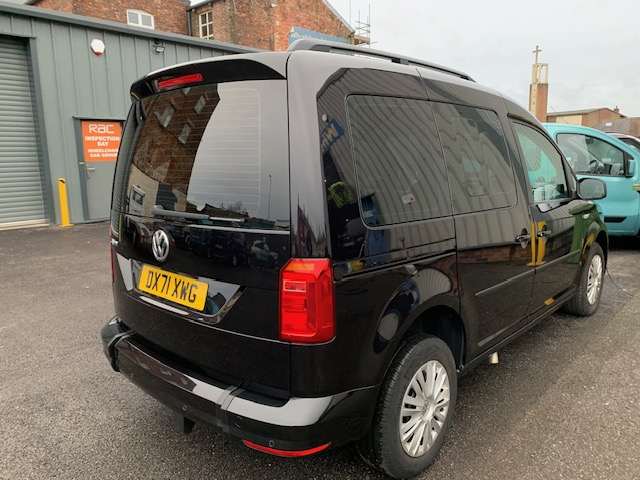 Volkswagen Caddy is an automatic wheelchair passenger upfront car, and the disabled person rides next to the driver. 3 seats plus the chair,It has Classy Black metallic paint. Registered late 2021. The lowered floor of this car goes all the way to the dash, power tailgate, and ramp. It’s a lovely car. All straps and belts to secure the wheelchair, spare keys, Full MOT, and scarce car. Service history, Spare keys and a six-month warranty (extendible to 12 months RAC), Valeted to the highest standard. It is immaculate throughout, with a genuinely pristine interior and genuine 20000 miles from new, UK delivery service, part exchange welcome, low rate finance; please call The Wheelchair Car Group 9am~8pm any day, including weekends on 0161 793 5934 (Stock Ref; DX71 XWG).