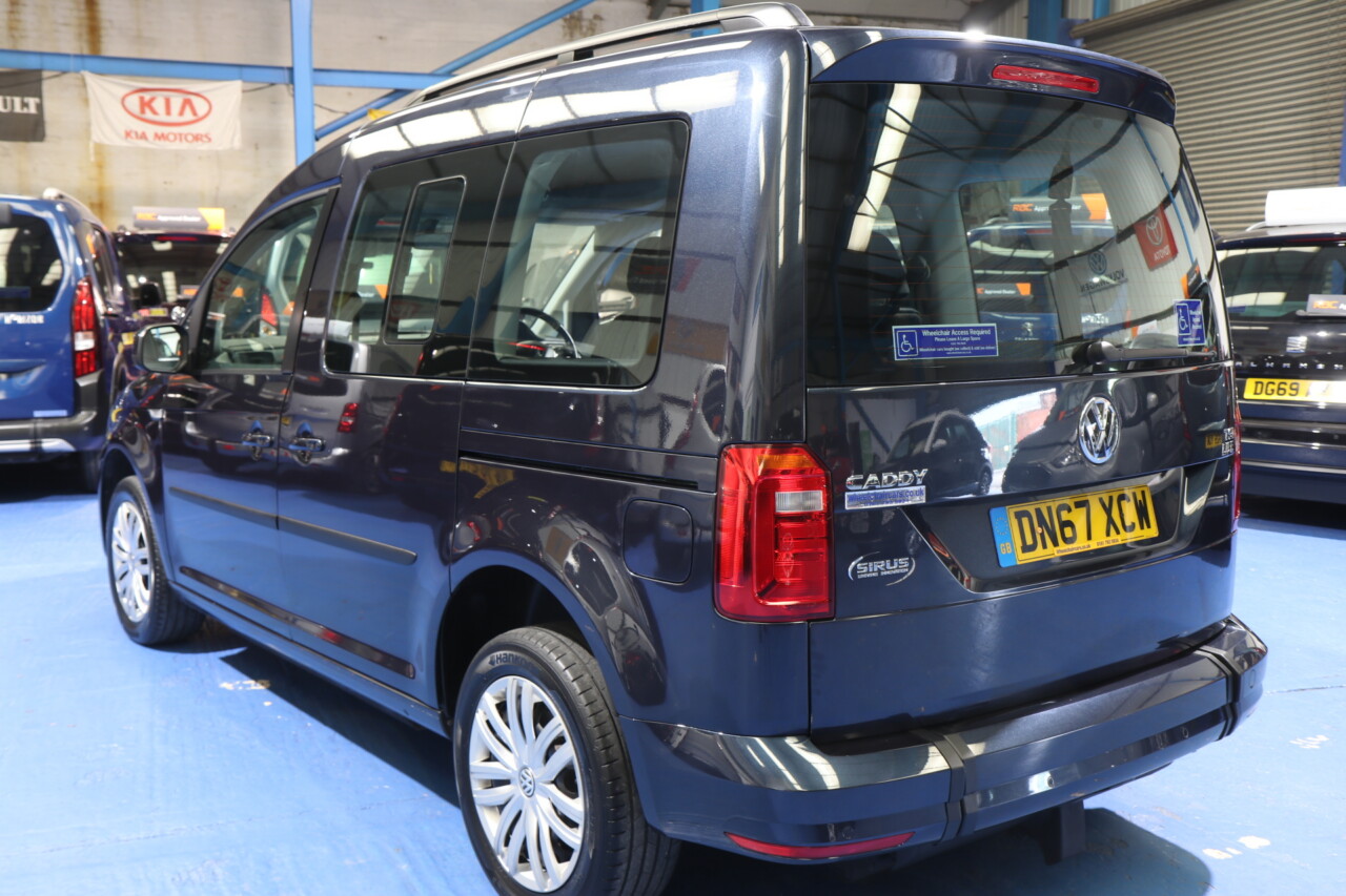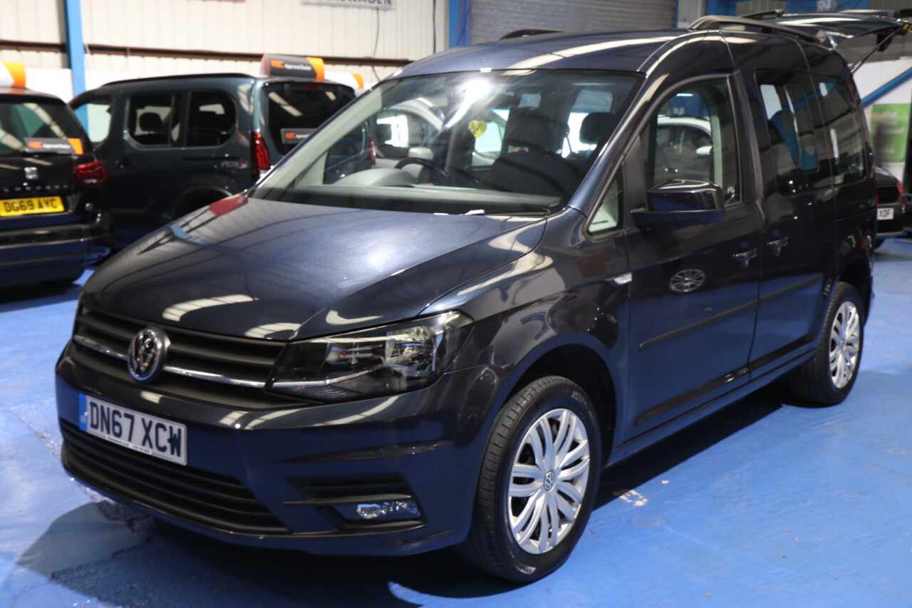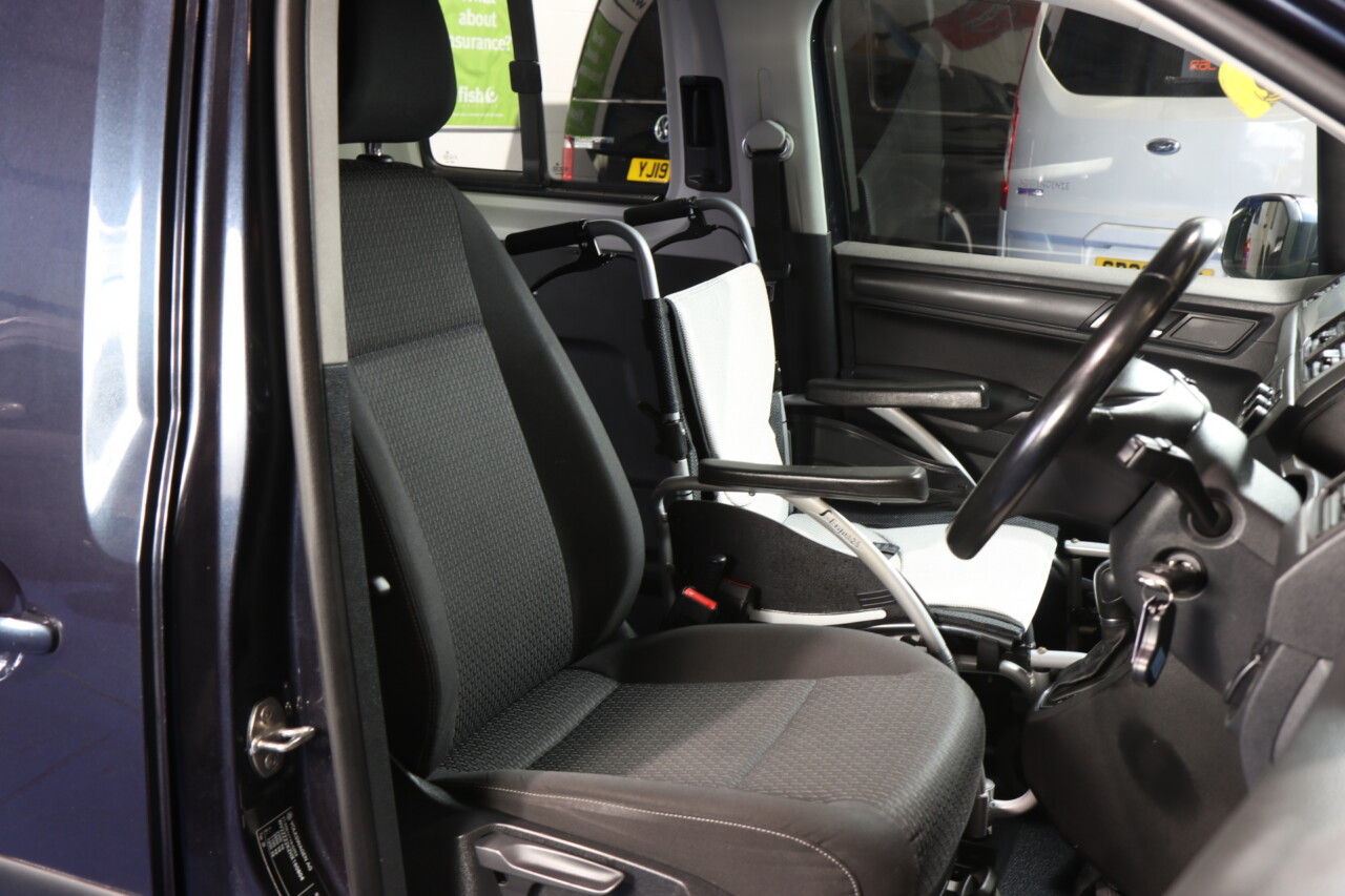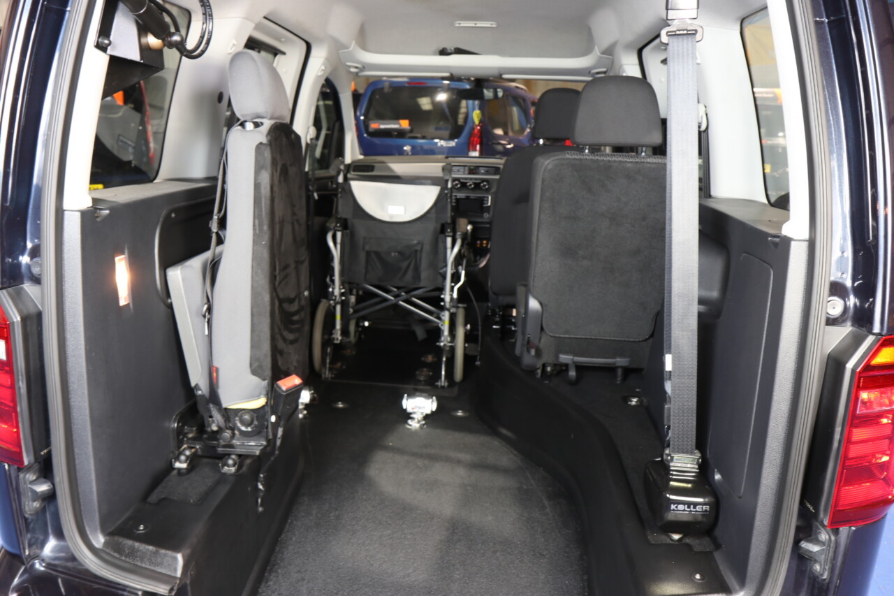Volkswagen Caddy is an automatic vehicle; the wheelchair passenger sits upfront next to the driver. It has dark metallic blue paint. The lowered floor of this car goes all the way to the dashboard, power tailgate, and ramp. It’s a lovely car. All straps and belts are needed to secure the wheelchair, spare keys, a full MOT, and a scarce car. Service history, Spare keys and a three-month warranty (extendible to 12 months RAC), Valeted to the highest standard. It is immaculate throughout, with a genuinely pristine interior and genuine 8800 miles from new, UK delivery service, part exchange welcome, low rate finance; please call The Wheelchair Car Group 9am~8pm any day, including weekends on 0161 793 5934 (Stock Ref; Dnxcw).